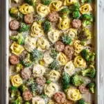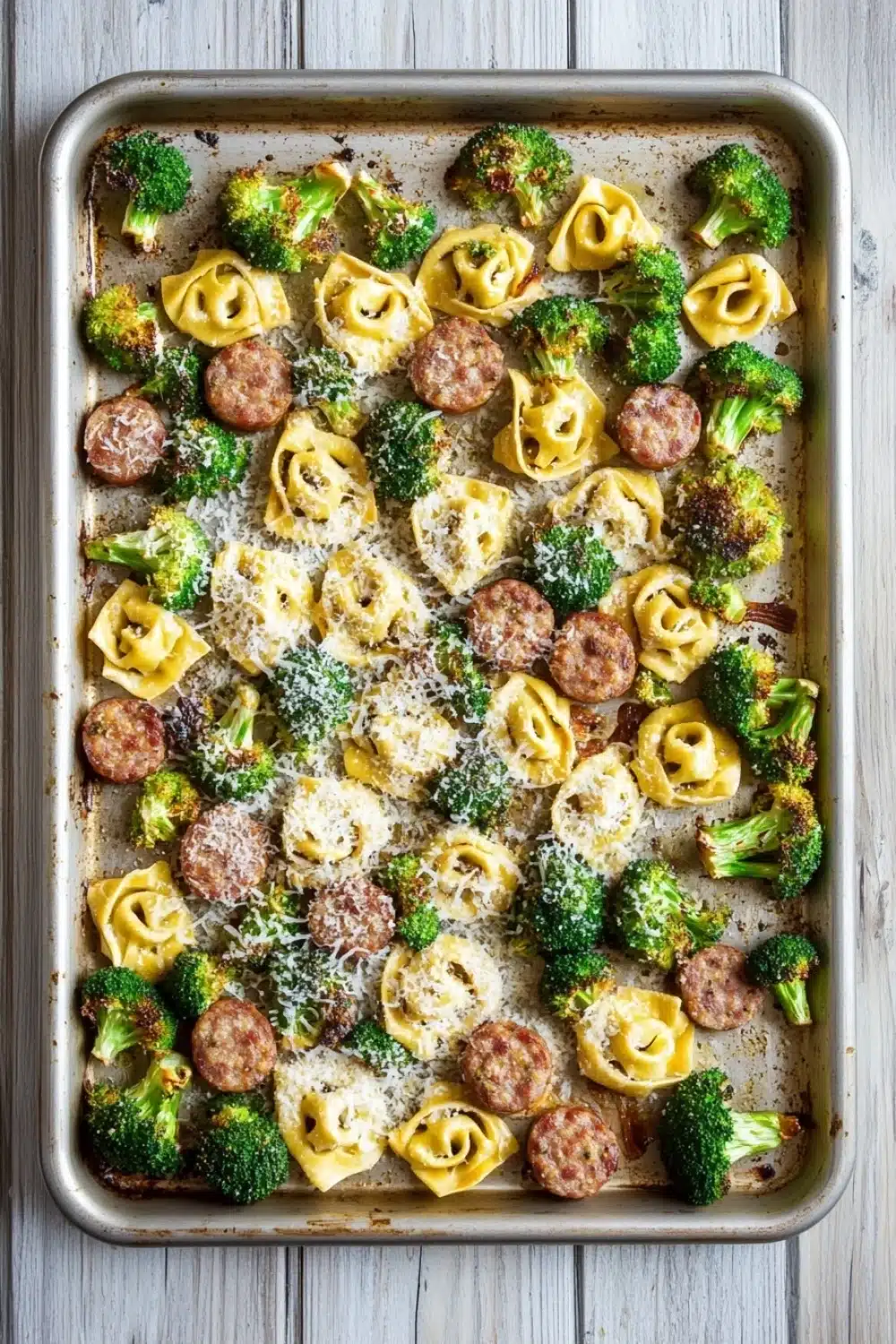 A quick and easy one-pan meal featuring savory sausage, cheese-filled tortellini, and roasted broccoli, all baked together for a delicious and satisfying dinner.