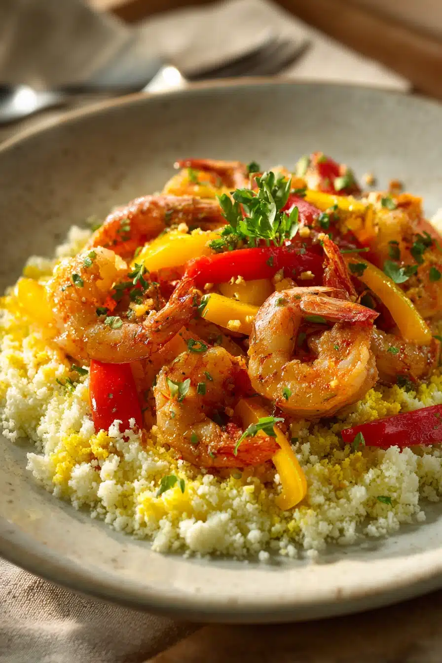 A flavorful and spicy Caribbean-inspired dish featuring succulent jerk-seasoned shrimp served over light and fluffy cauliflower rice. Perfect for a low-carb, healthy meal with bold island flavors.