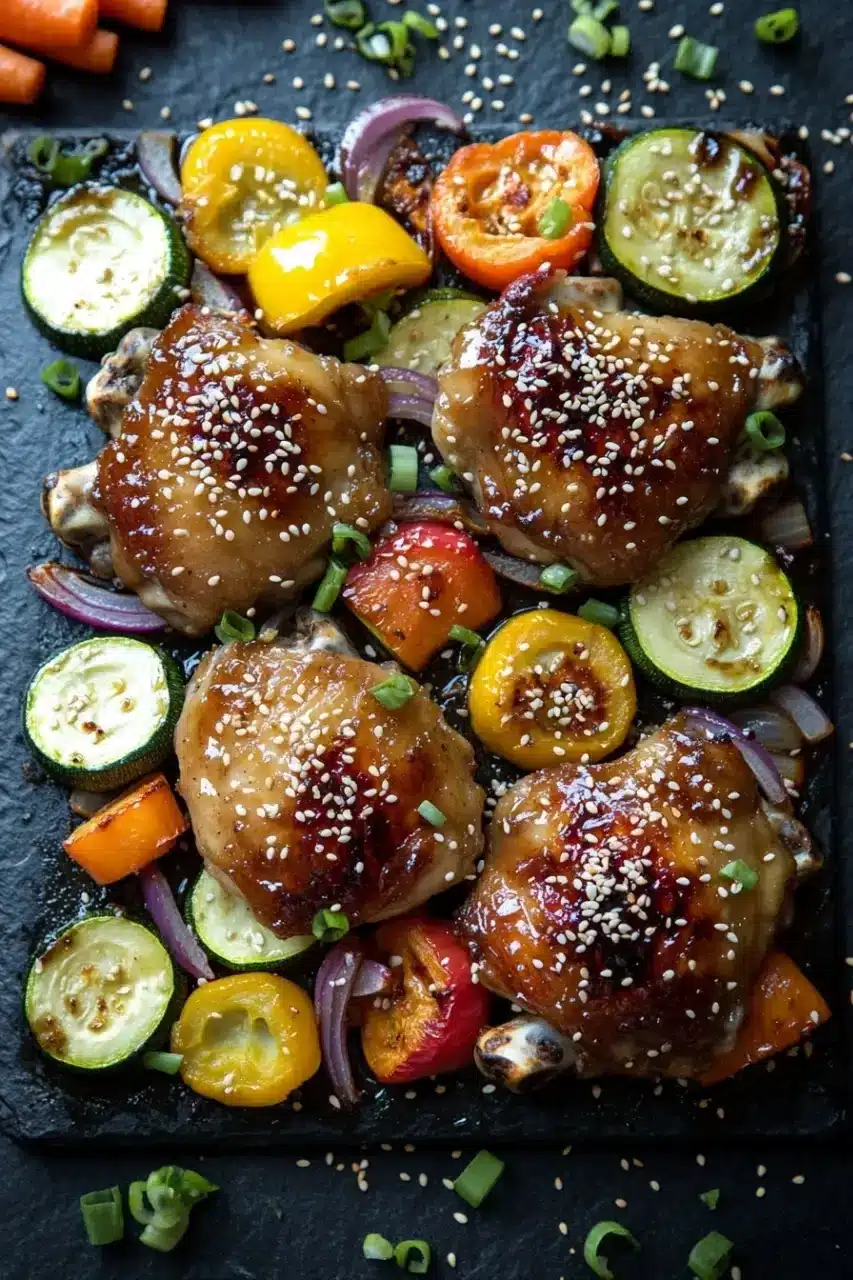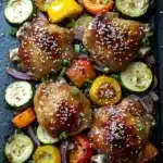 A quick and flavorful one-pan meal featuring tender chicken thighs marinated in a garlic soy sauce, roasted alongside a medley of colorful vegetables. Perfect for an easy weeknight dinner with minimal cleanup.