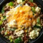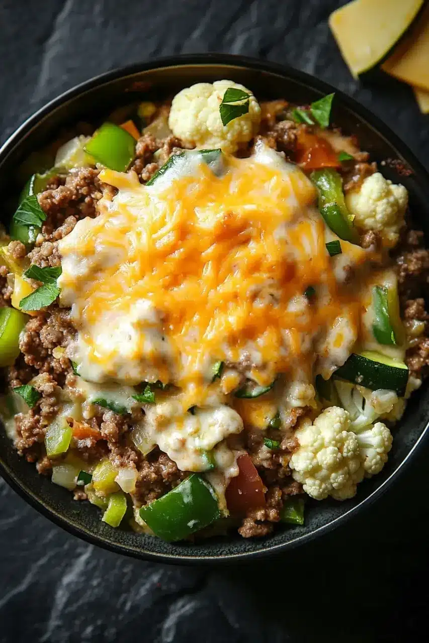 A hearty and delicious low carb ground beef casserole perfect for a satisfying dinner. Packed with vegetables and cheese, this casserole is easy to prepare and great for meal prep.