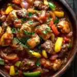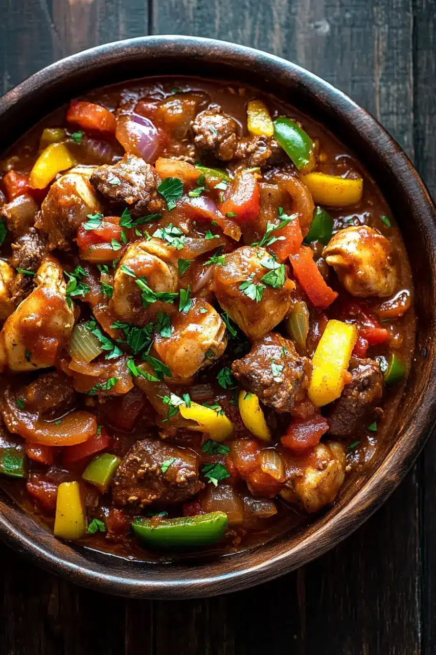 A hearty Italian stew combining tender beef and chicken simmered in a rich tomato sauce with bell peppers, onions, and herbs. Perfect for a comforting family meal.
