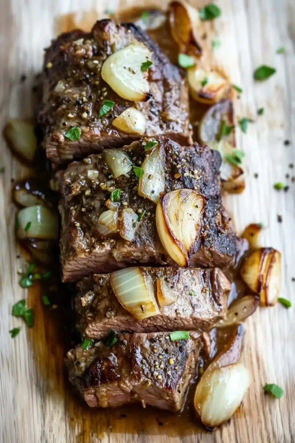 Add the sliced onion and minced garlic to the crock pot, spreading them evenly over the beef.