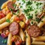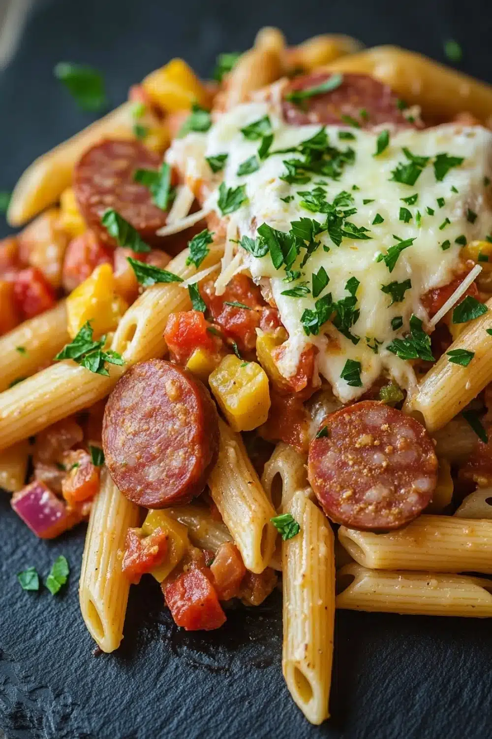 A hearty and flavorful pasta dish featuring smoky kielbasa sausage, sautéed vegetables, and a savory tomato sauce, perfect for a comforting dinner.
